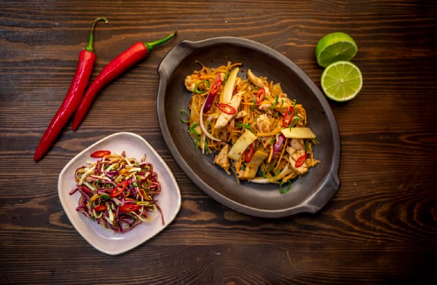 Mausteinen teriyakikana-perunanuudelivuoka hiukan tulisella twistillä hurmaa maullaan!