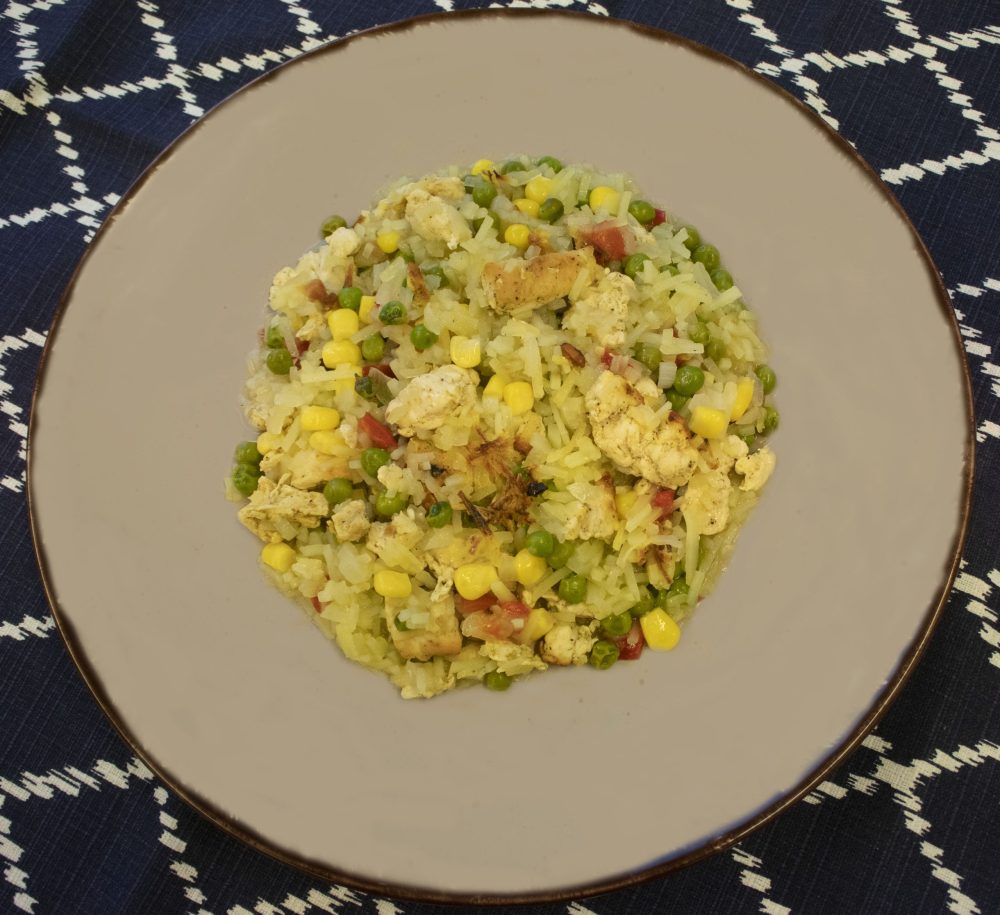 Kaada jäiset perunanuudelit GN ½ 65 mm -vuokaan. Lisää kanasuikaleet, herne-maissi-paprikat sekä sipulit perunanuudelien päälle ja sekoita.