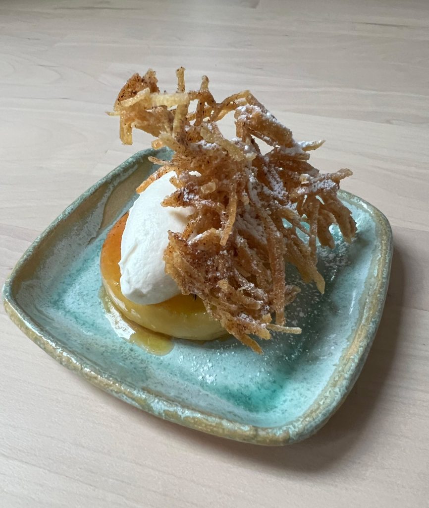 Karamellisoidut omenat, sitruuna-chantilly ja tippaperuna